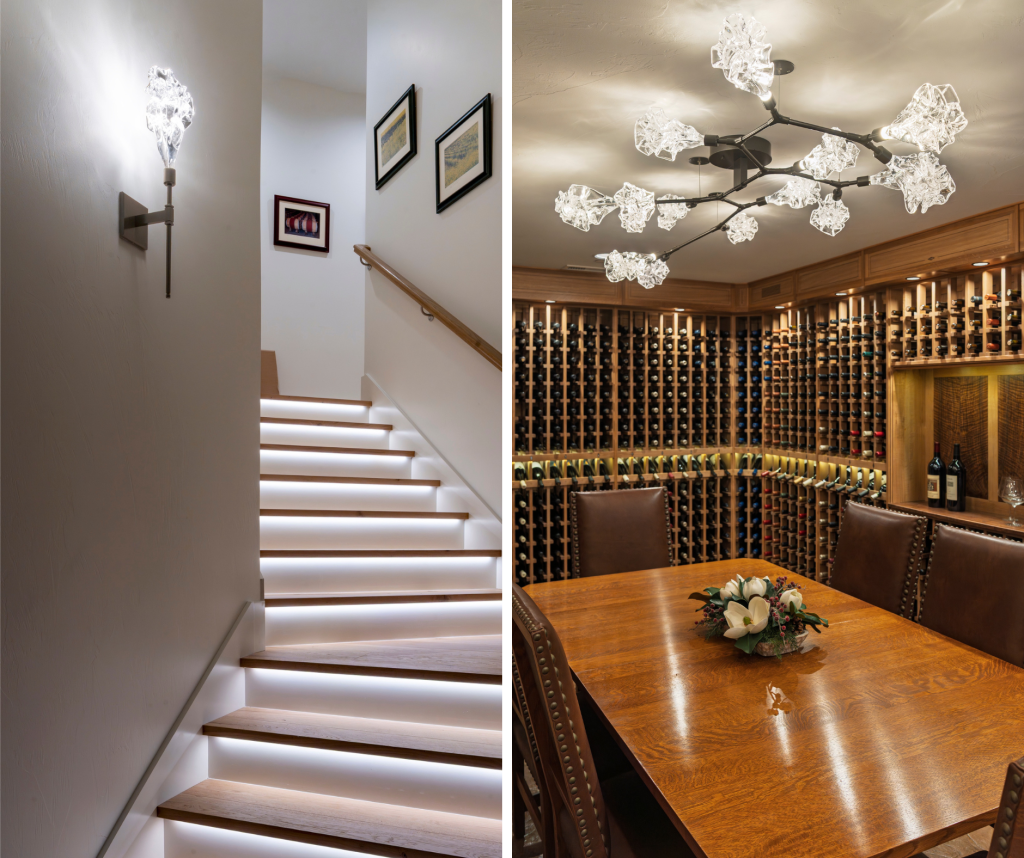 Spatial constraints were addressed with the same level of intention. Above the stairwell, a sprawling custom Gem Flush Mount was created to meet low-ceiling requirements while maintaining visual impact—demonstrating how custom lighting solutions can be both functional and eye-catching.