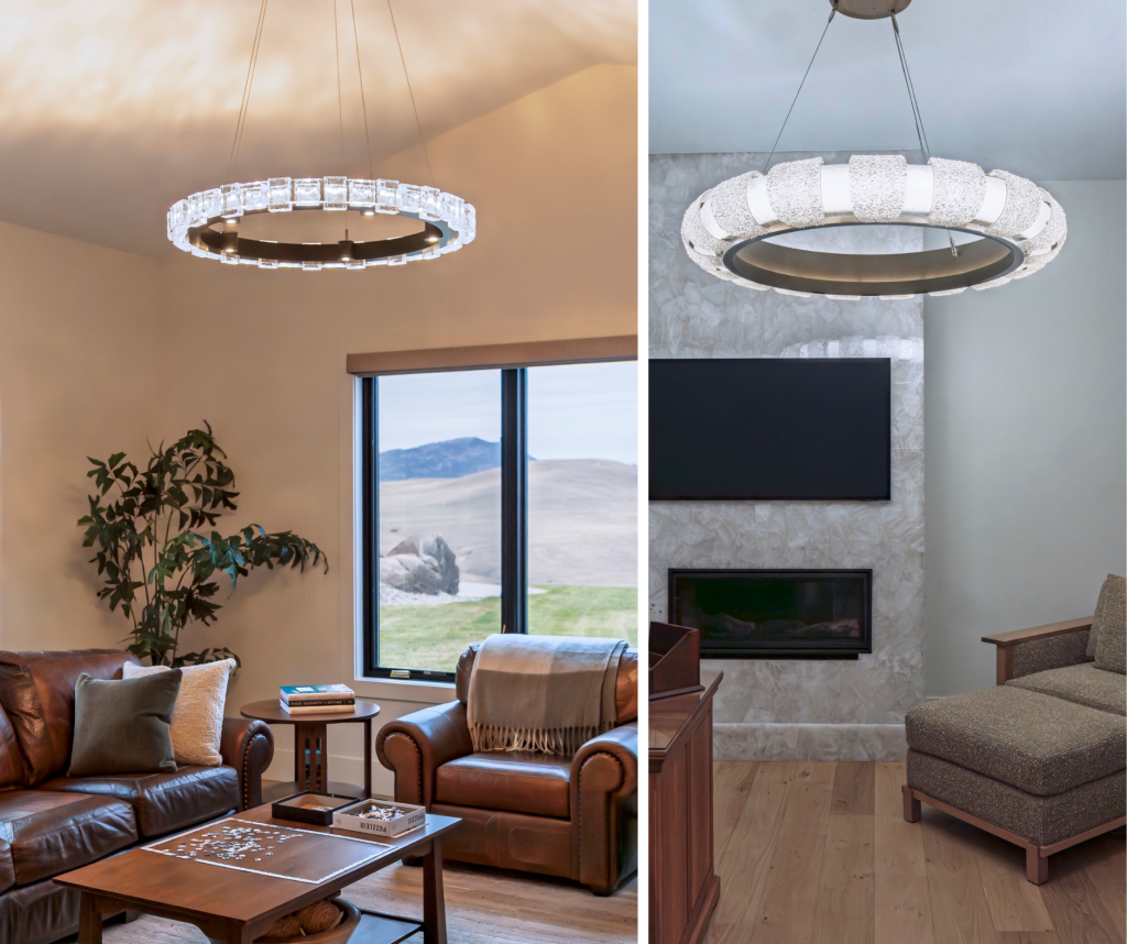Though each space features lighting tailored to its purpose, recurring silhouettes create cohesion throughout the home. Ring forms—seen in both the Tessera Ring and Hammerton Signature Odeon chandelier—establish a shared visual language, proving how thoughtful design repetition can unify diverse spaces.